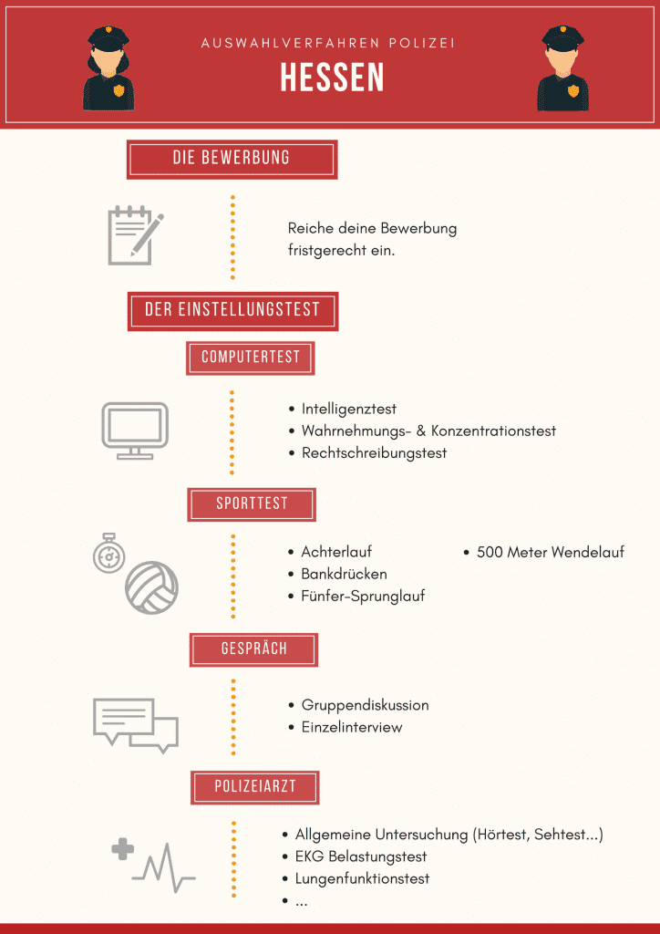 Als erstes Bundesland führte Hessen die ausschließlich zweigeteilte Laufbahn (gehobener und höherer Dienst) ein, im Bereich mittlerer Dienst erfolgen keine Einstellungen. Der Eignungstest dauert rund 1,5 Tage und findet in Wiesbaden an der Polizeiakademie Hessen statt. Diese Stationen erwarten Dich: