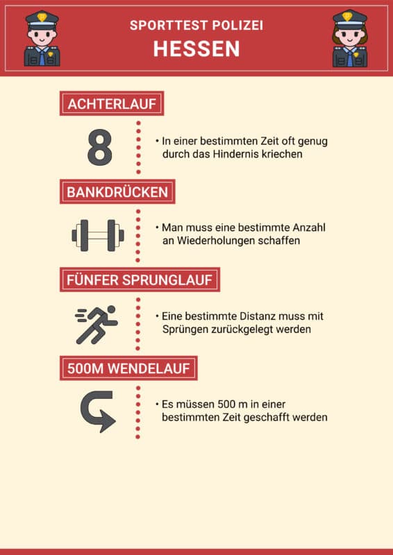 Der Einstellungstest wartet im nächsten Abschnitt mit sportlichen Herausforderungen auf. Um Deine körperliche Leistungsfähigkeit zu testen, absolvierst Du bei der Polizei Hessen einen Sporttest. Bei der Polizei Hessen ist der Eignungstest im Sportbereich in unterschiedliche Disziplinen unterteilt: Achterlauf (fünf Runden): Hier werden Schnelligkeit, Ausdauer, Geschicklichkeit und Beweglichkeit getestet. In Form einer 8 musst Du fünf Mal um zwei Hindernisse laufen, dabei Sitzkontakt auf dem mittleren Kasten aufnehmen und im Schnittpunkt durch ein offenes Kastenelement tauchen. Anforderungen
