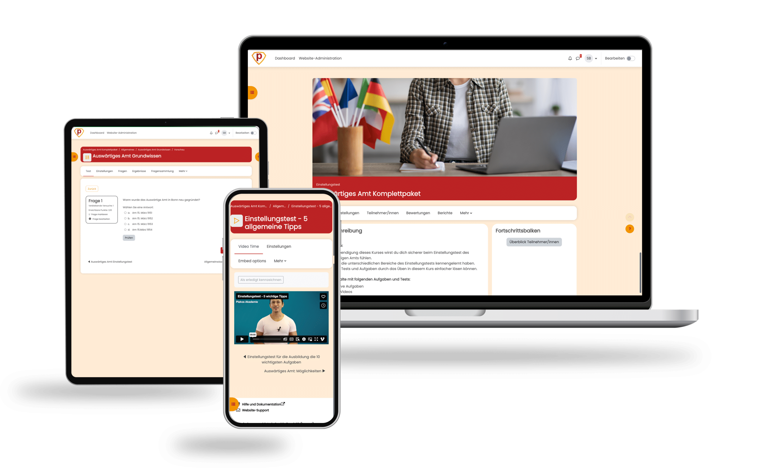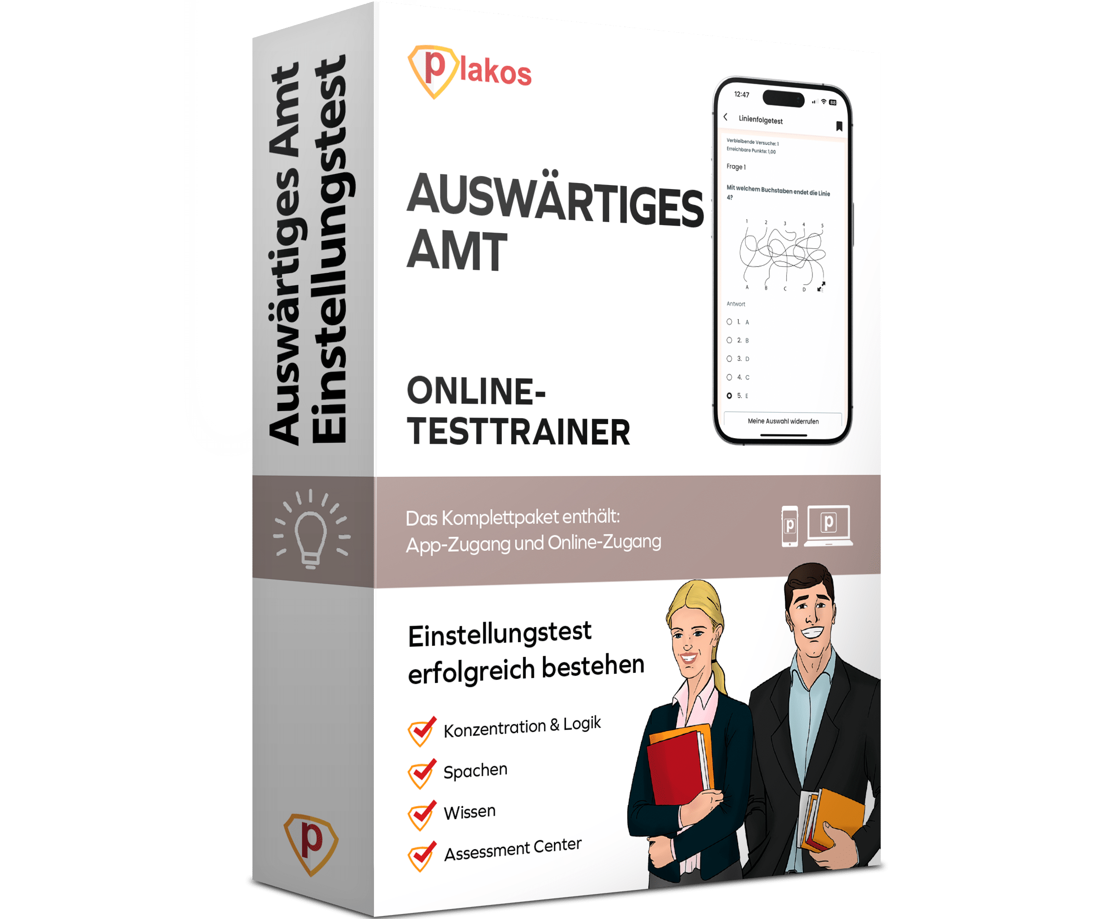 Wir bereiten Dich in unserem Kurs optimal auf den Einstellungstest für das Auwärtige Amt vor. Unser Testtrainer enthält nicht nur hunderte Übungsaufgaben und interaktive Tests mit Lösungen, sondern auch wertvolle Erklärvideos und Insidertipps, die Dir helfen, bestens vorbereitet zu sein.