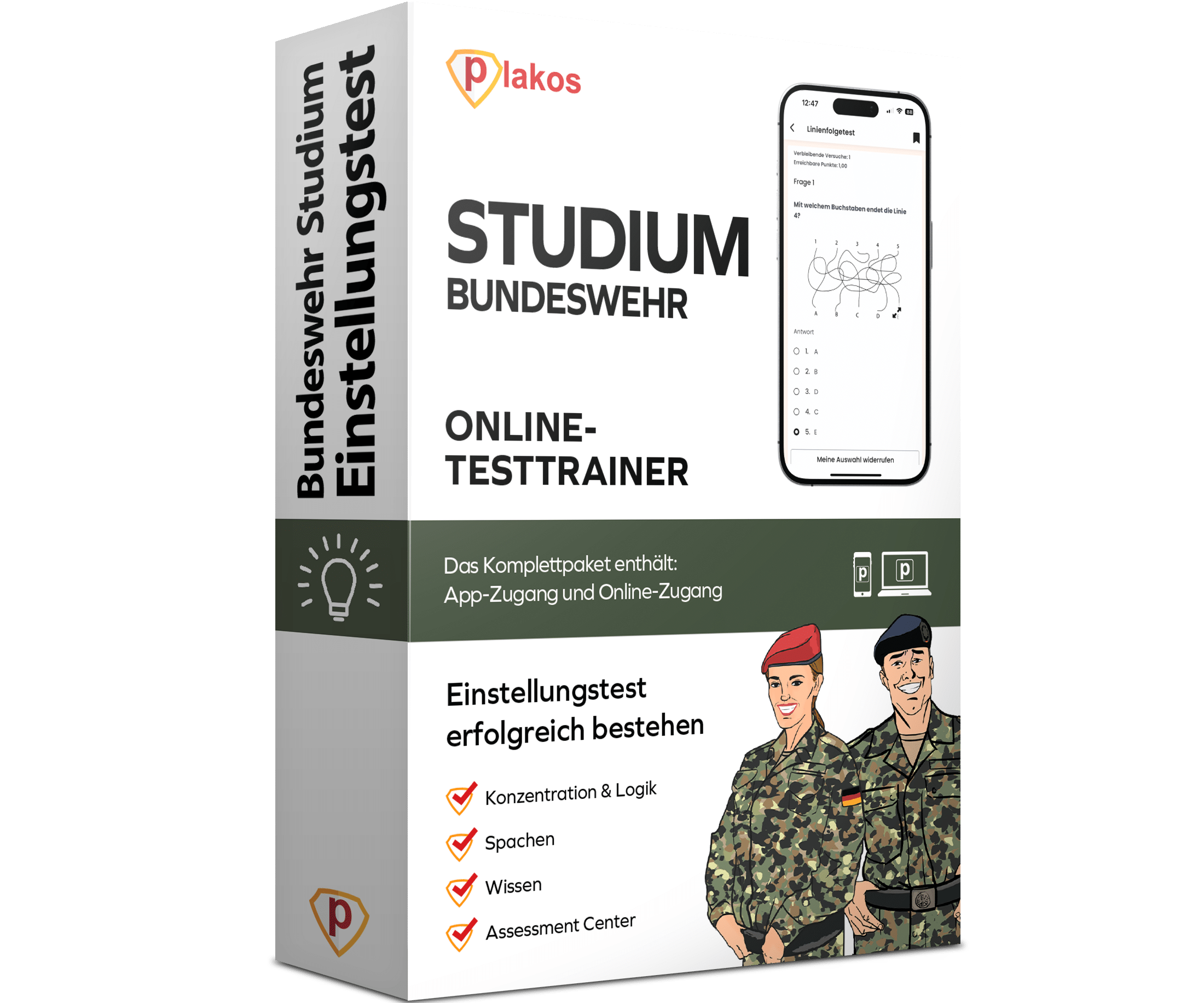 Du strebst ein Studium bei der Bundeswehr an? Bereite Dich jetzt effektiv auf den Einstellungstest vor! Unser Online-Testtrainer Komplettpaket bietet Dir die perfekte Vorbereitung für den Eignungstest der Bundeswehr und hilft Dir, Deine Nervosität zu besiegen.