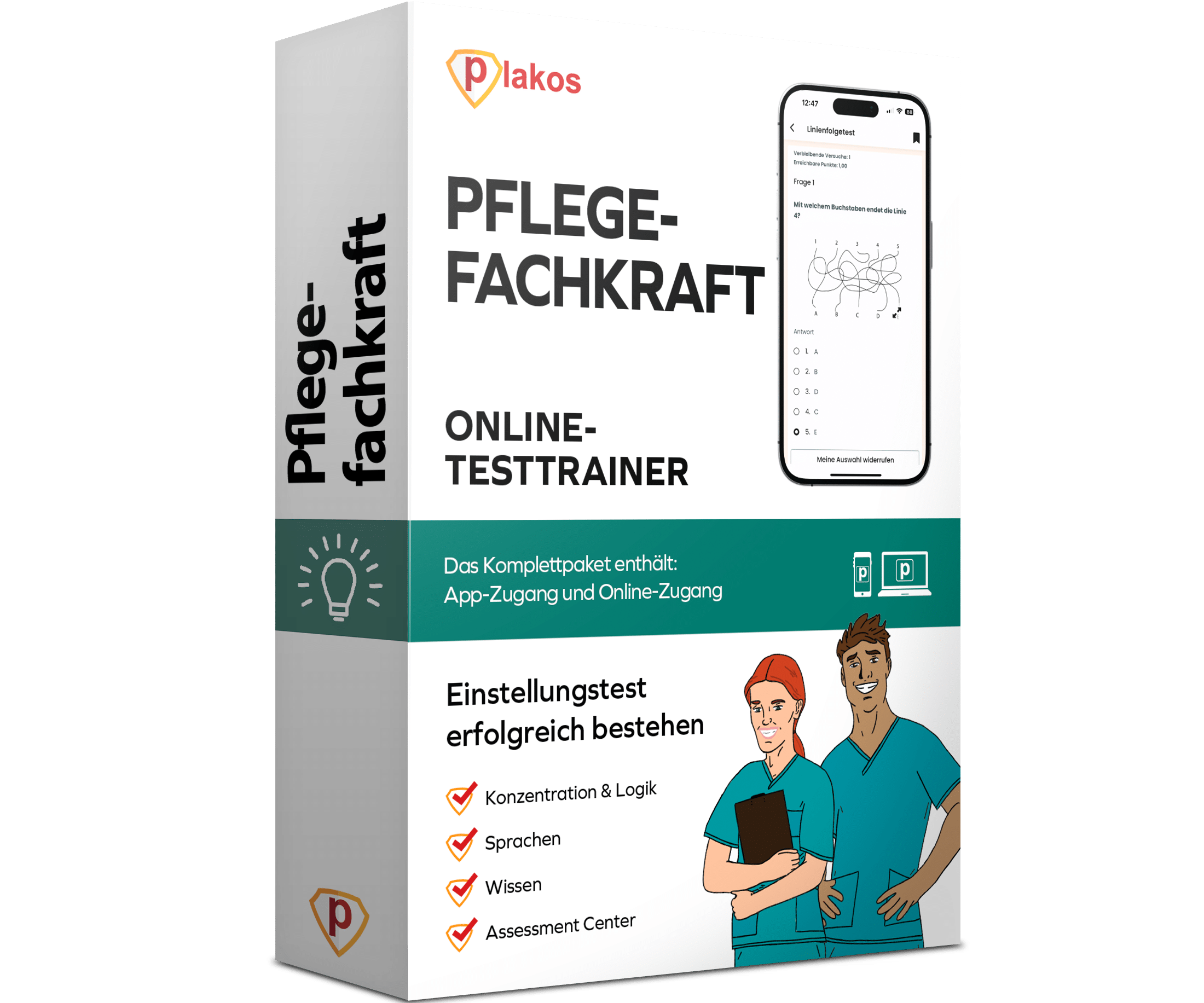 Wenn du jetzt dich fragst wie du dich optimal auf diesen Test vorbereiten kannst, dann bietet dir Plakos dazu eine sehr gute Möglichkeit. Und zwar kannst du dich ganz einfach online mit unserem Testtrainer für Pflegefachkräfte vorbereiten. Hier kannst du online und interaktiv mit deinem Smartphone, Laptop oder Tablet mit hunderten von Übungsaufgaben trainieren, die an die echten Einstellungstest Aufgaben angelehnt sind. Zusätzlich erhältst du Lernvideos und wertvolles Hintergrundwissen sowie viele wichtige Zusatzinfos rund um das Auswahlverfahren für die Pflegefachkräfte.