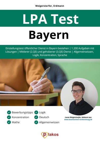 Jährlich nehmen bayernweit über 8.000 Menschen am Auswahlverfahren für die Ausbildungs- und Studienplätze in der öffentlichen Verwaltung, kurz LPA-Test, teil. In diesem Buch zeigen wir Dir, wie Du Dich effektiv auf den Beamtentest Bayern vorbereitest. Neben 1.200 Aufgaben mit Lösungen findest Du viele praktische Infos zu den einzelnen Testabschnitten, dem öffentlichen Dienst im Allgemeinen sowie der Prüfungsvorbereitung.