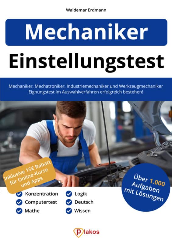 Damit Du den Einstellungstest für Mechaniker bestehst, haben wir ein Buch basierend auf unseren Online-Programmen auf plakos.de entwickelt. Du möchtest eine Ausbildung und Karriere als Mechaniker machen? Du möchtest den Einstellungstest bestehen?