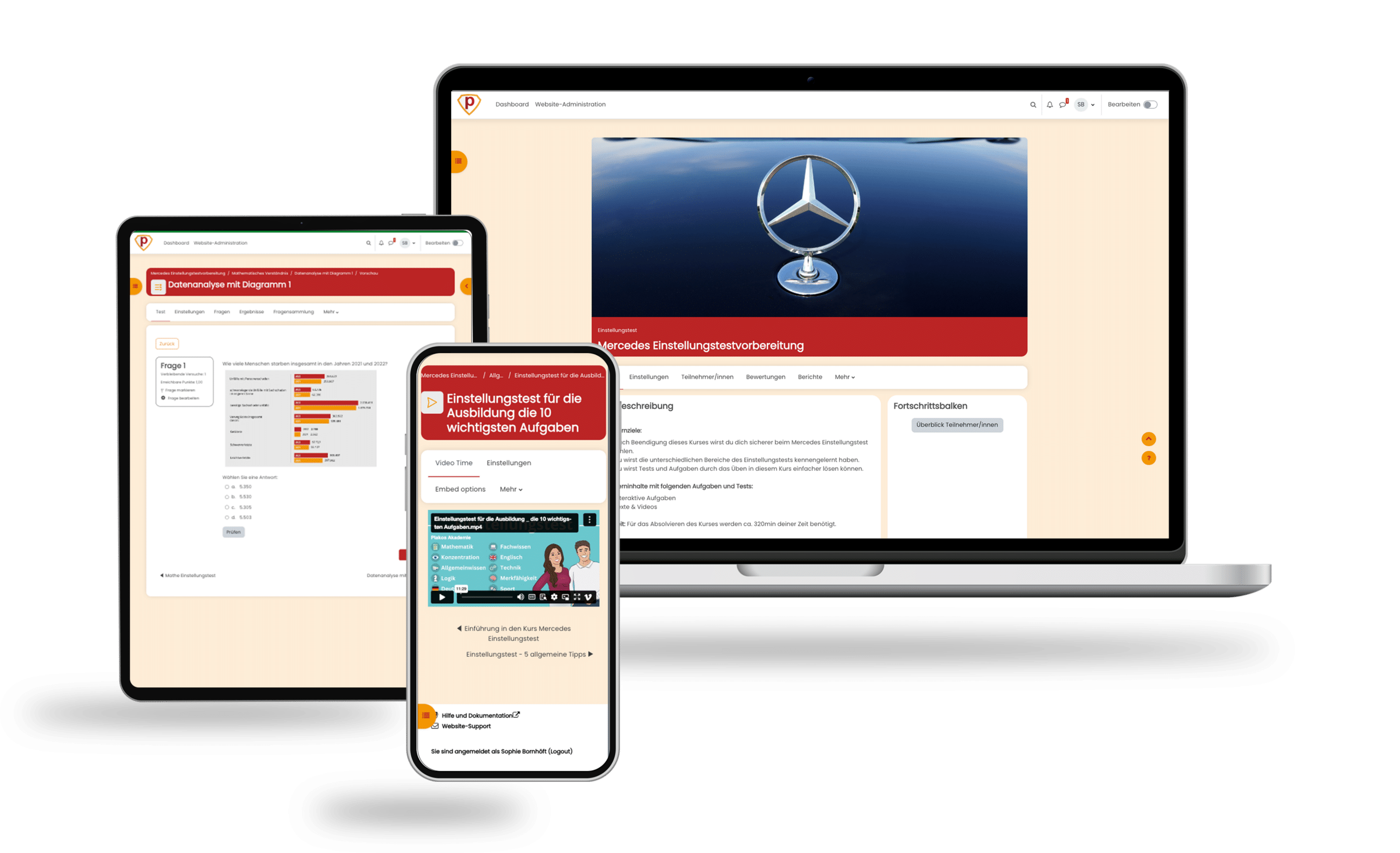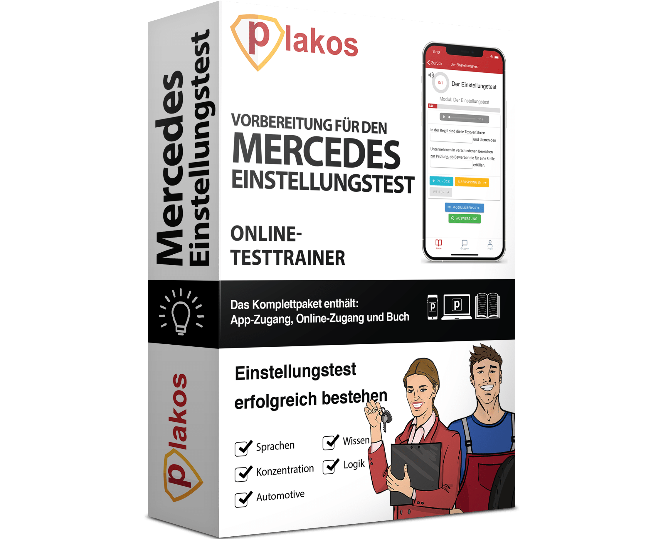 Das Online-Testtrainer Komplettpaket von Plakos bietet dir die perfekte Vorbereitung auf den Einstellungstest des Automobilherstellers Mercedes-Benz. Wir helfen dir, deine Nervosität zu besiegen und ermöglichen dir, mit einem sicheren Gefühl in den Mercedes Einstellungstest zu gehen!