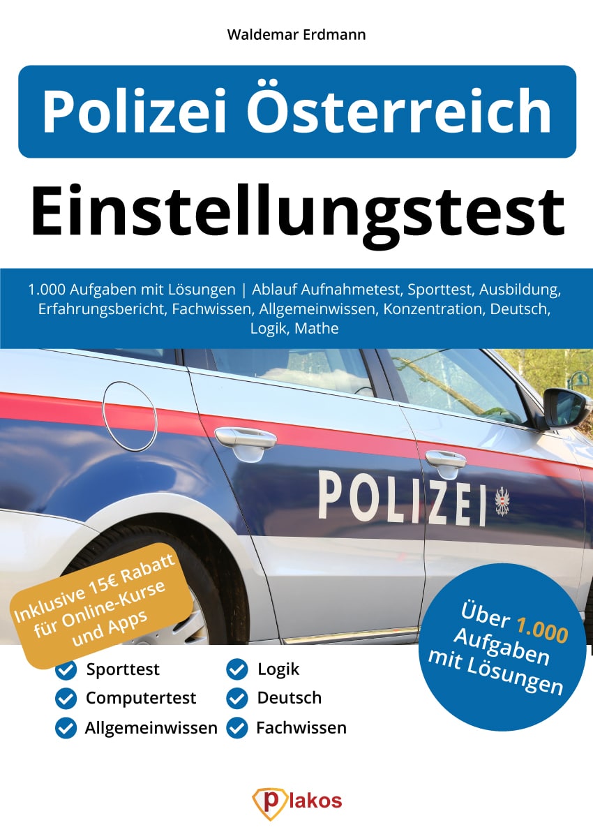 Im Buch findest Du lediglich eine Auswahl an Testaufgaben. Zur umfassenden Vorbereitung empfehlen wir Dir unseren thematisch passenden Polizei Österreich Einstellungstest Online-Testtrainer (Print + Digital) mit weiteren Aufgaben.