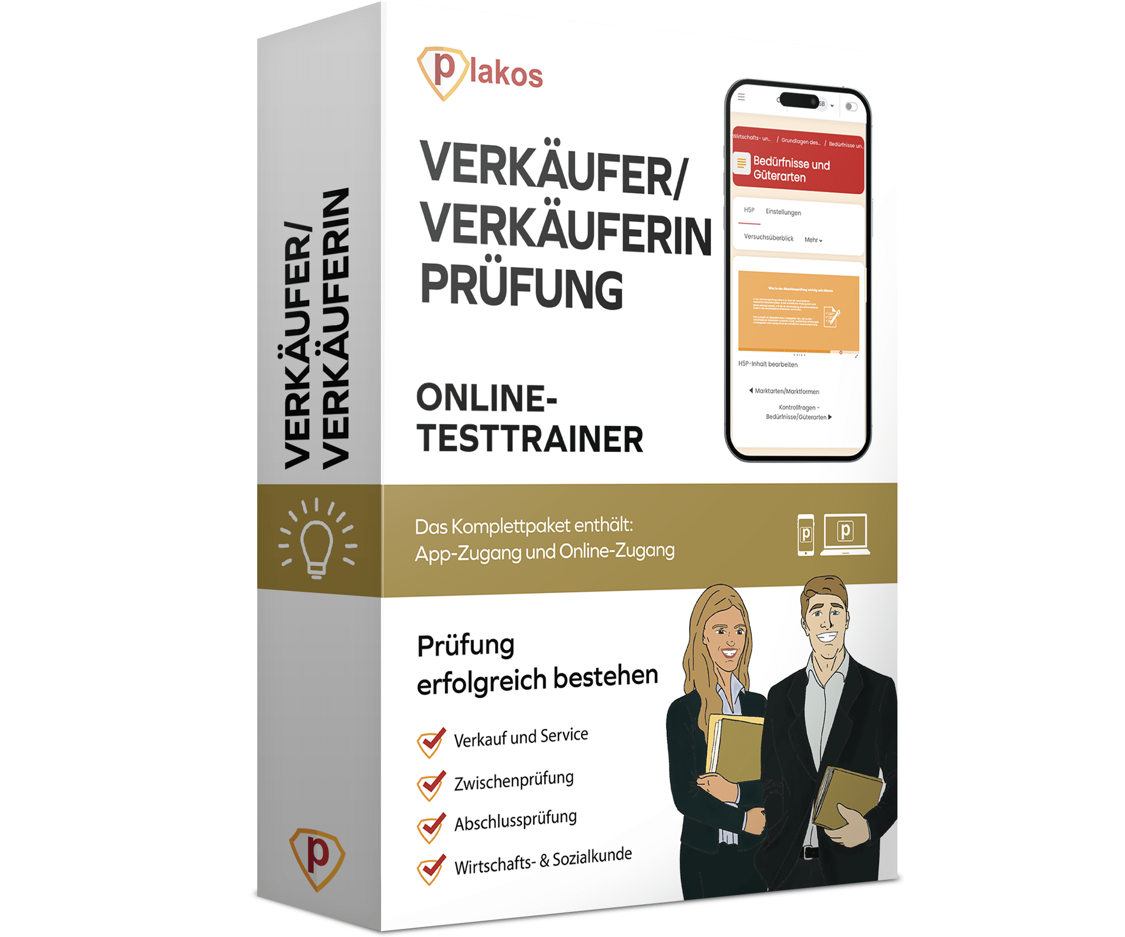 Wir haben einen Online-Trainer zur Prüfungsvorbereitung für Verkäufer erstellt, der sich exakt mit den Prüfungsfragen und Aufgaben beschäftigt, die regulär beim der Abschlussprüfung zum Verkäufer drankommen. Somit erhältst du mit unserem Test nicht nur einen Überblick über mögliche Themen und Fragen – du erhältst auch einen Überblick über deinen Wissensstand und kannst so gezielt die Fächer üben, die du noch nicht so gut kannst. Damit sparst du Zeit. Diese Zeit kannst du für weitere Tests einsetzen, welche ebenfalls alle in dem Online-Trainer enthalten sind.
