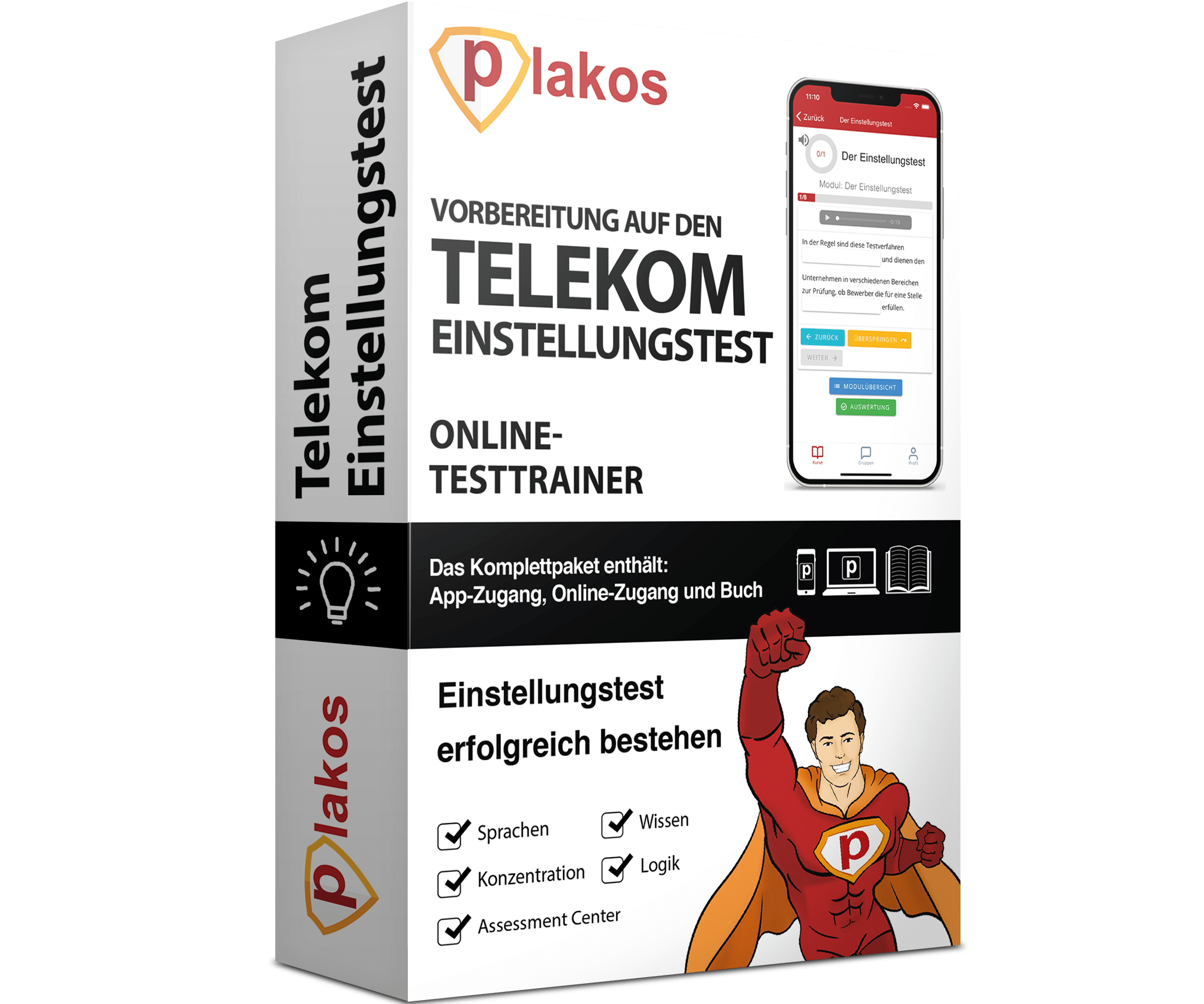 Jetzt auf den Telekom Einstellungstest vorbereiten: Das Online-Testtrainer Komplettpaket von Plakos bietet Dir die perfekte Vorbereitung auf den Einstellungstest und hilft Dir Deine Nervosität zu besiegen. Mach jetzt im Voraus mit den verschiedenen Aufgabentypen vertraut und gehe mit einem sicheren Gefühl in Deinen Test.