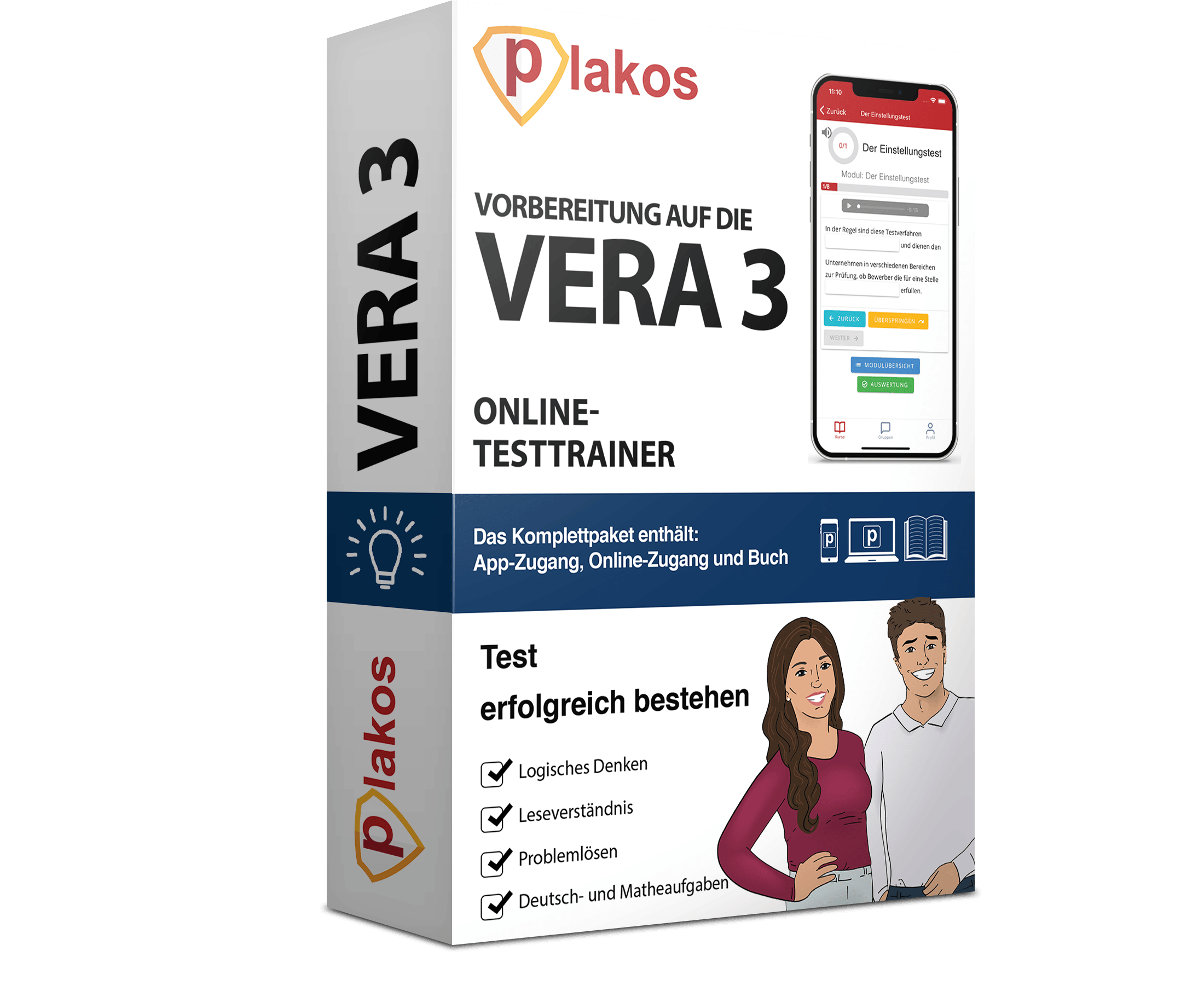 Unser VERA 3 Online-Testtrainer dient zur allgemeinen Vorbereitung auf die VERA 3 (Vergleichsarbeiten dritten Klasse). Mit unserem Testtrainer können Schülerinnen und Schüler online und mit Spaß für die VERA 3 üben und so im Test ein besseres Ergebnis erzielen. Hinweis: VERA 3 wird in einigen Bundesländern auch als Kompetenztest, Lernstandserhebung oder KERMIT bezeichnet.